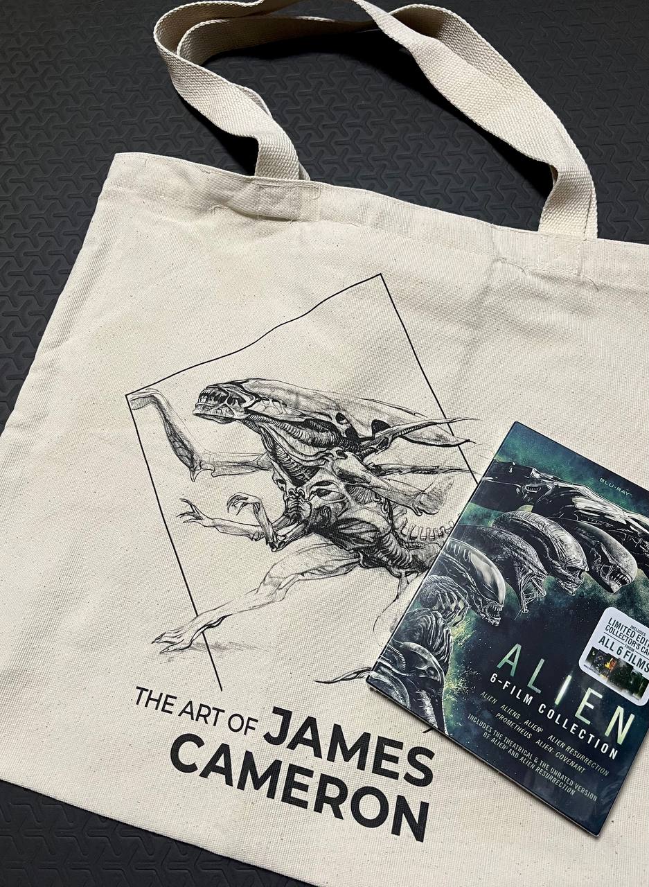 Внутри: шопер с рисунком ксеноморфа, сделанный самим Кэмероном (добыли на большой выставке режиссера в Стамбуле) и Blu-ray с шестью фильмами из франшизы «Чужой».