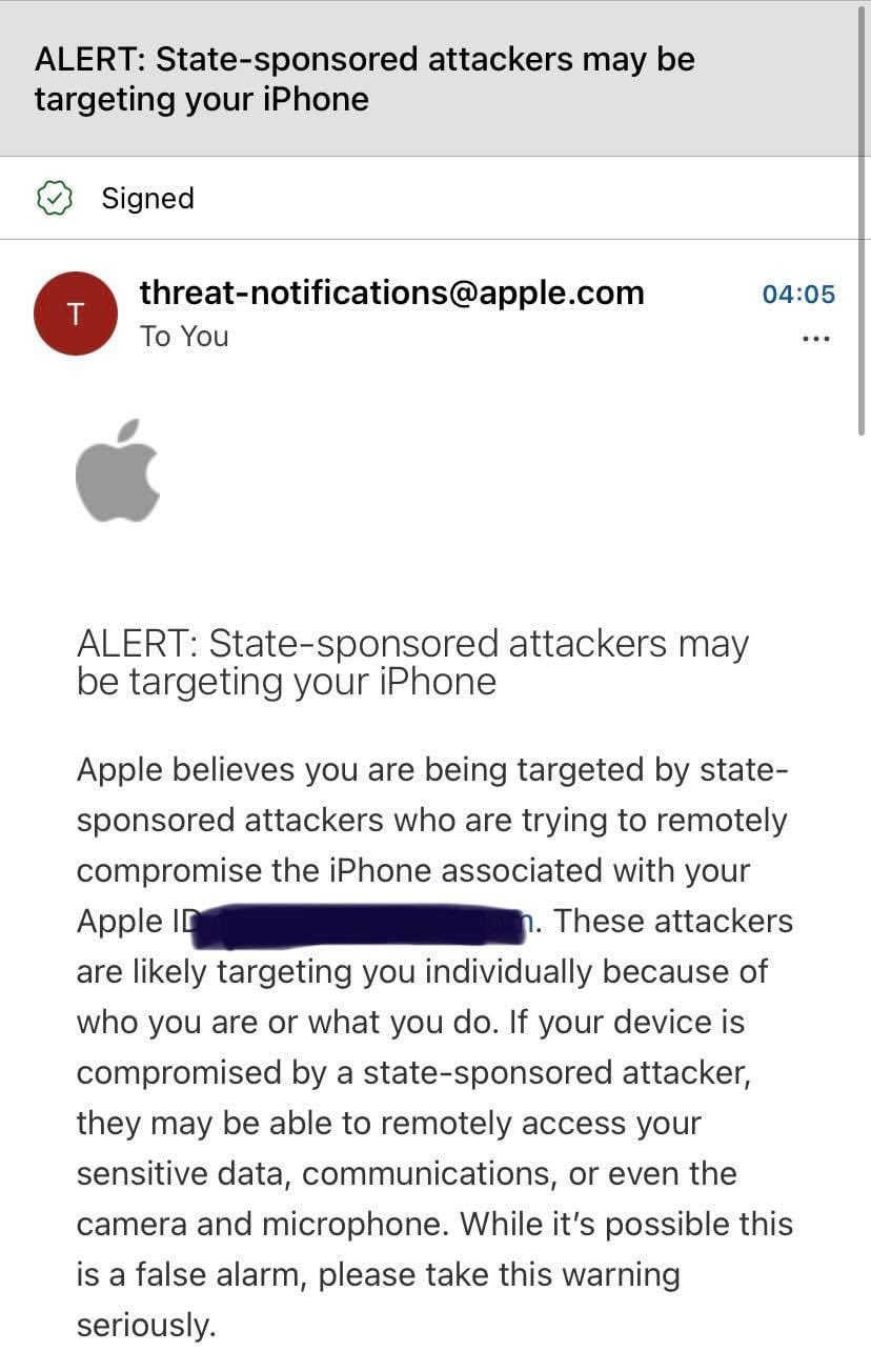 К счастью, Apple неплохо умеет ловить за рукав израильскую разработку. Жертвам приходит тревожное сообщение "ALERT: State-sponsored attackers may be targeting your iPhone" в почте и Messages от отправителя