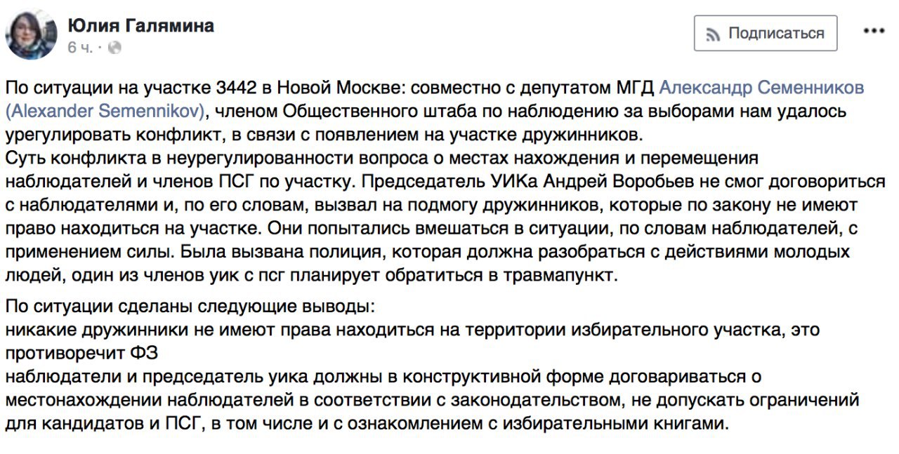 Юлия Галямина сообщила о нарушении на участке №3442: якобы там появились дружинники, в результате чего пришлось урегулировать конфликт. Все бы ничего, но участок, по ее мнению, находится в Новой Москве — в Воскресенске (https://m.facebook.com/story.php?story_fbid=2228650303844169&id=100000976634979).