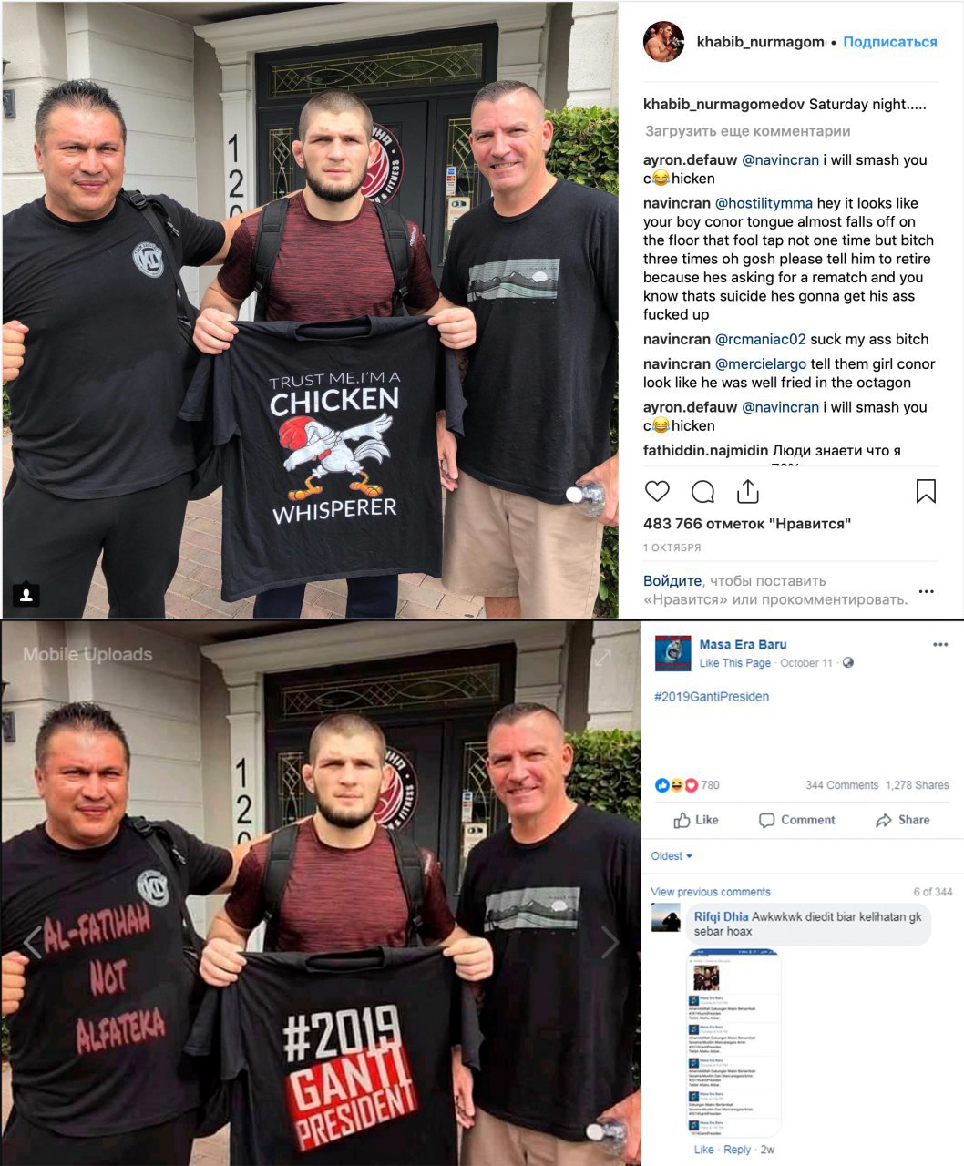 Однако на самом деле это всего лишь фотошоп. Кто-то просто переделал одну из издевательских фотографий Хабиба, сделанную после боя с Макгрегором. На футболке было написано: "Я дрессировщик петухов".