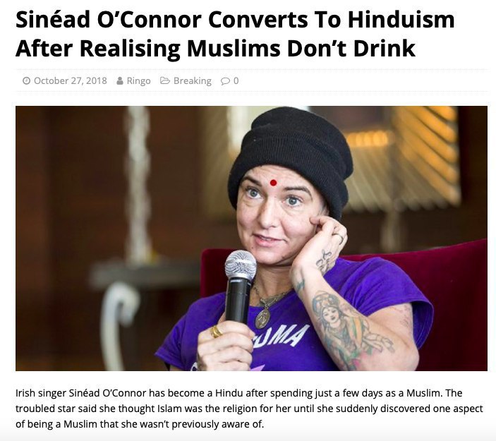 По рунету бродит скриншот с новостью о том, что известная своими скандальными выходками ирландская певица Шинейд О’Коннор уже успела в третий раз сменить религию, отказавшись от принятого ей в октябре 2018 года ислама и перейдя в буддизм. Якобы подобное решение связано с тем, что О’Коннор лишь спустя месяц узнала о том, что ислам запрещает употребление алкоголя, к которому предрасположена певица.