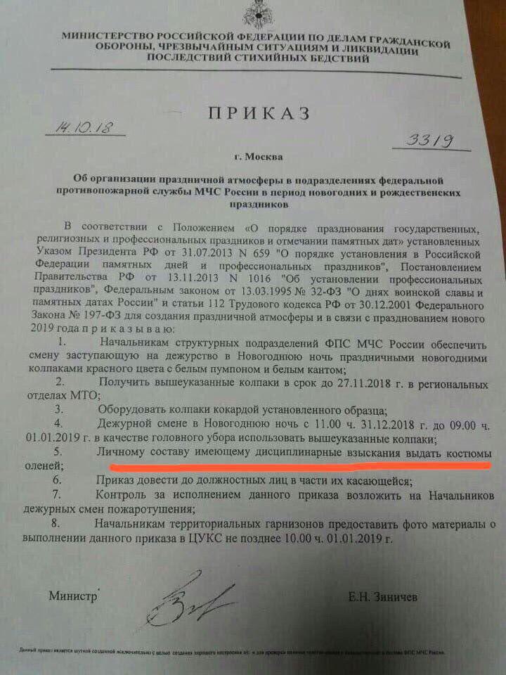 В сети появился некий "приказ" МЧС "Об организации праздничной атмосферы в подразделениях федеральной противопожарной службы МЧС России в период новогодних и рождественских праздников". В нем, в частности, присутствует такой забавный пункт: "Личному составу имеющему дисциплинарные взыскания выдать костюмы оленей".