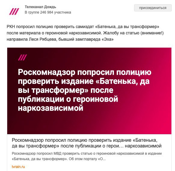 "Дождь" начал бороться с 5-й колонной в либеральных рядах. Издание нашло виновного в требовании МВД заблокировать статью самиздата "Батенька, да вы трансформер" о наркозависимой женщине, которое привело в итоге к удалению статьи. Им оказалась "бывший замглавреда" "Эха" Леся Рябцева. Якобы именно она направила в РКН просьбу проверить издание.