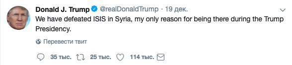 За несколько часов до того, как объявить о выводе американских войск из Сирии Дональд Трамп сообщил о победе на ИГ в своем Твиттере: "Мы разгромили ИГ в Сирии, что было единственной целью, из-за которой я держал там американские войска".