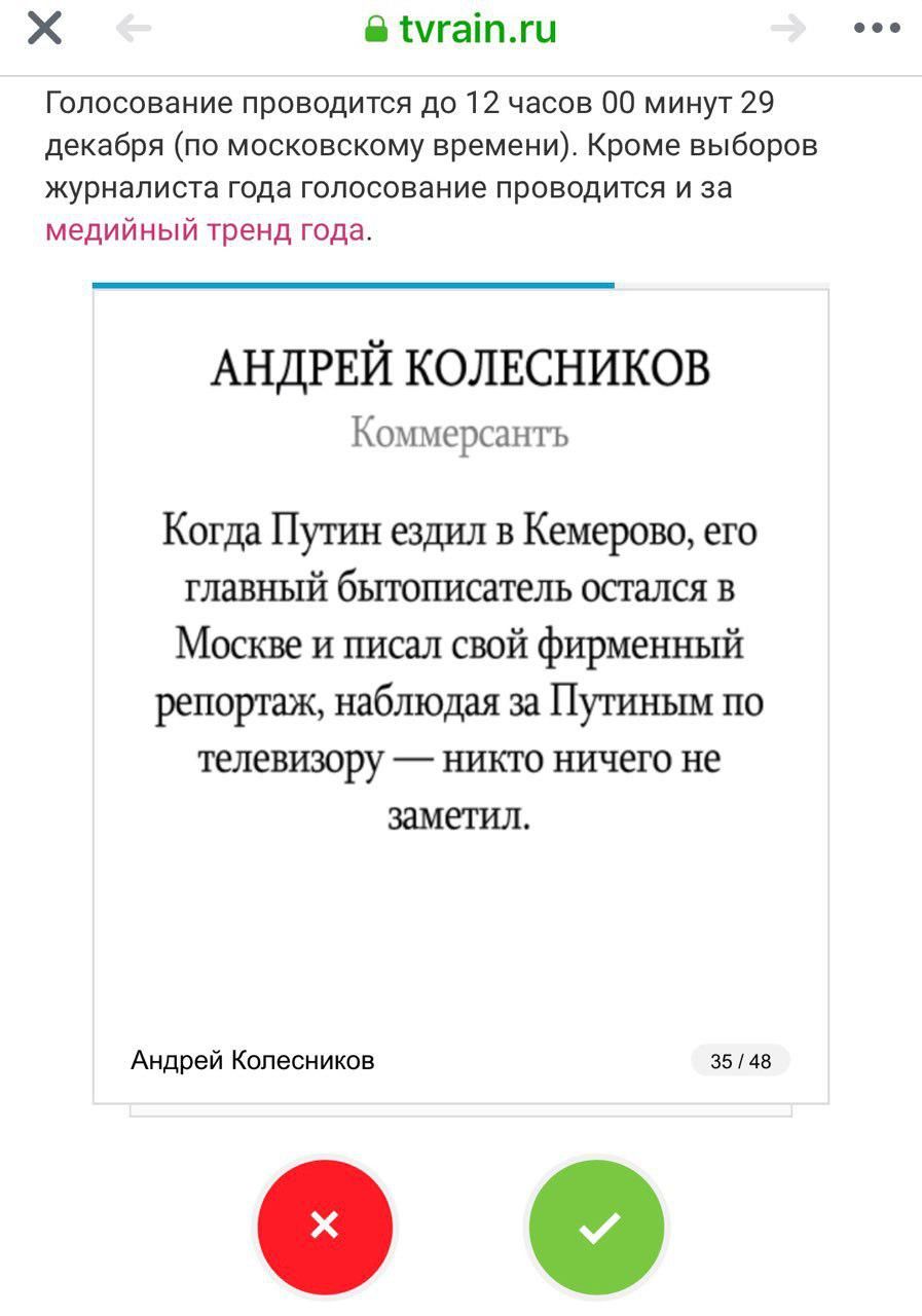 "Дождь" не совсем объективно относится к одному из самых известных журналистов "кремлевского пула" Андрею Колесникову, давая вот такой странный комментарий к его кандидатуре в интернет-голосовании "журналист года-2018".