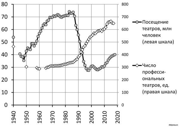 Вице-премьер Ольга Голодец на Гайдаровском форуме заявила о феноменальном росте количества людей, посещающих российские театры. По ее мнению, побиты даже советские рекорды: «40 млн — это небывалые цифры, у нас не было такого уровня посещения даже в советское время, когда численность населения была существенно больше».