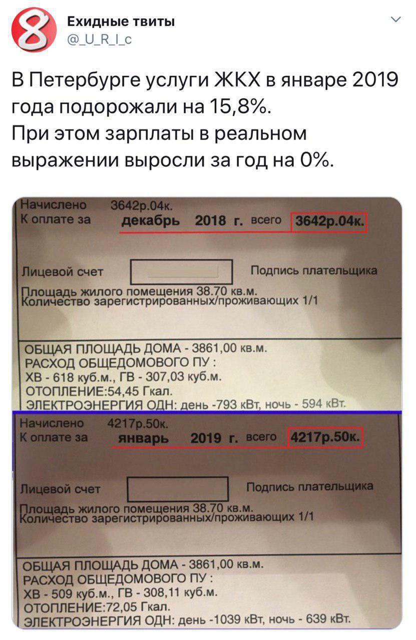 Ряд пабликов в социальных сетях утверждают, что в Петербурге услуги ЖКХ резко подорожали почти на 16%, при нулевом росте зарплат. В качестве доказательства выдаются две платежки: за декабрь 2018 и январь 2019. В январе начисленная сумма действительно больше почти на 16%. Однако если приглядеться, то можно заметить, что и электричества израсходовано было больше. Собственно, этим и объясняется столь разительная разница в квартплате. Видимо, на новогодние праздники человек просто проводил больше времени дома.