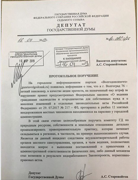 Фейк "Панорамы" о том, что некий пенсионер разбил чиновникам машины на своей старой "Волге" дошел до Госдумы. Почему-то данный стёб "Панорамы" так привлек внимание депутата Госдумы от ЛДПР Александра Старовойтова, что тот даже написал поручение Комитету ГД по природным ресурсам провести проверку инцидента.
