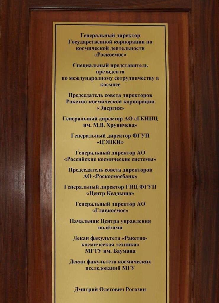 Адекватный человек, конечно, вещать бы такую табличку в стиле полного императорского титула не стал бы. Не стал этого делать и Дмитрий Рогозин. Очевидно, что фото — фейк. Дело в том, что Рогозин большинство из этих должностей не занимает. Например, директором АО ГКНПЦ им. Хруничева является не Рогозин, а Алексей Варочко.