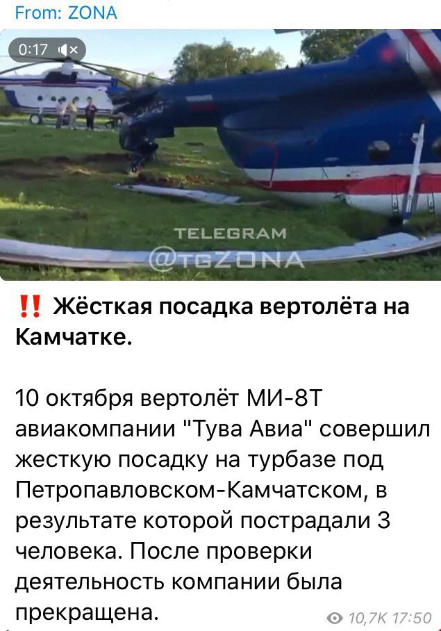 Телеграм-канал “ZONA” опубликовал пост о жесткой посадке вертолета МИ-8Т компании "Тува Авиа" под Петропавловском-Камчатским. Утверждается, что 3 человека пострадали, а деятельность самой компании была прекращена. Прилагается и видео.