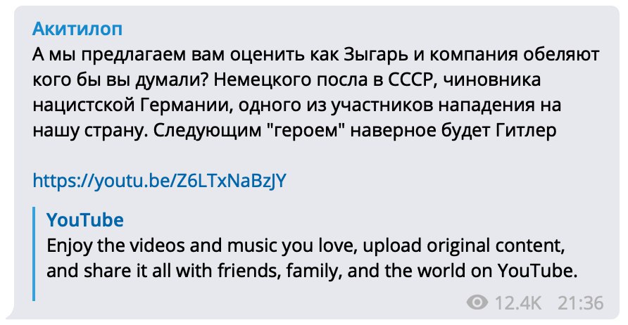 «Акитилоп» возмущается тому, что Михаил Зыгарь выпустил материал о Вернере Шуленбурге. Якобы Зыгарь «обеляет одного из участников нападения на нашу страну». По мнению канала, «следующим «героем» наверное будет Гитлер».