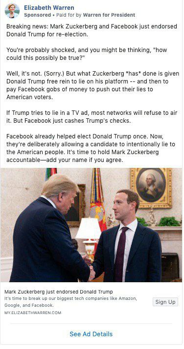 Одна из вероятных кандидатов в президенты США от Демократической партии Элизабет Уоррен пишет о том, что Марк Цукерберг и Facebook якобы поддержали избирательную кампанию Дональда Трампа. Речь идёт о том, что Цукерберг якобы предоставил Трампу неограниченные возможности по распространению через Facebook лжи, которую тот якобы не может распространять на телевидении. Якобы в отличие от ТВ Facebook просто принимает деньги и не задает никаких вопросов относительно правдивости распространяемого контента.