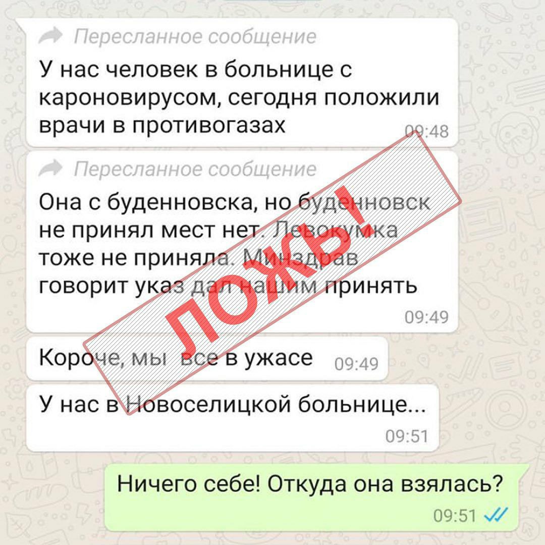 Продолжаю появляться фейки о распространении коронавируса в России. На этот раз они затронули Ставрополье. Так, в мессенджере WhatsApp появилась информация о том, что некую инфицированную коронавирусом женщину из Буденовска положили в одну из больниц Ставрополья, так как там уже "нет мест". В качестве подробностей автор фейка, который выдается себя за очевидца, утверждает, что лечащие больную врачи ходят в противогазах, что уже само по себе крайне подозрительно.