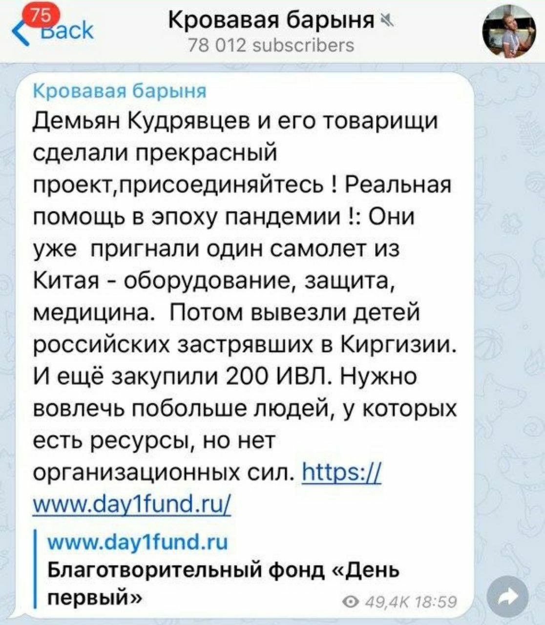 Ксения Собчак опубликовала пост, в котором утверждает, что издатель Демьян Кудрявцев якобы является основателем фонда «День первый», через который осуществляется закупка из Китая оборудования и защитных средств от коронавируса, а также эвакуация российских детей из Киргизии.