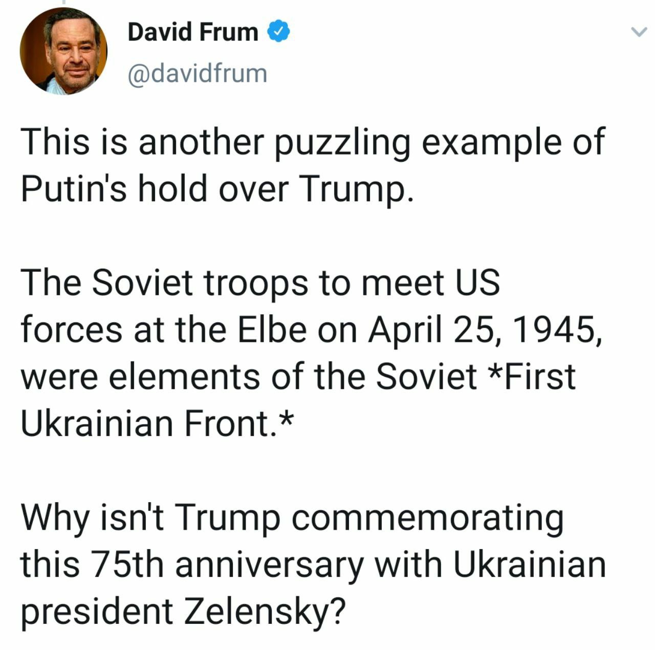 Американский политический комментатор Дэвид Фрум демонстрирует вершины исторической безграмотности и призывает Трампа отмечать 75-ю годовщину встречи советских и американских войск на Эльбе вместе с Зеленским, так именно части 1-го украинского фронта достигли 25 апреля Эльбы, где встретились с войсками союзников.
