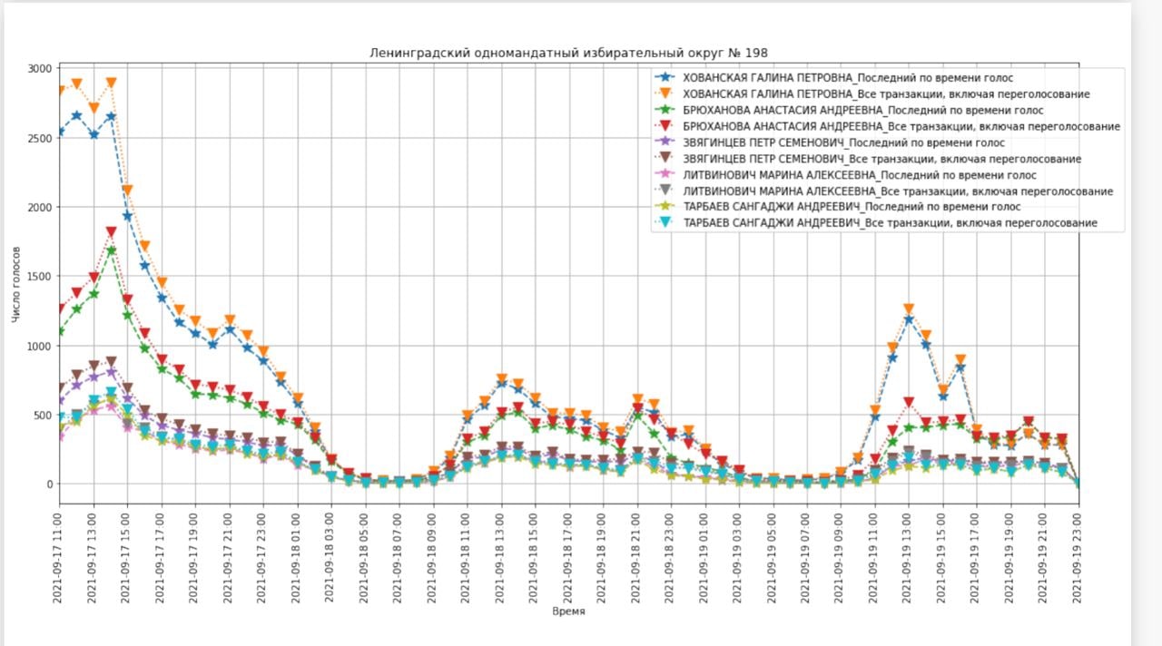 Проигравшие выборы в Москве оппозиционные кандидаты начали продвигать тезисы о том, что якобы дистанционное электронное голосование в Москве полностью сфальсифицировано. Например, пользуясь графиком голосования, экс-кандидат от Каца по 198 одномандатному округу Анастасия Брюханова в эфире «Дождя» заявила о том, что на протяжении всех трёх дней голосования наблюдались «медленные вбросы». Причем, по её словам, вбросы хорошо отслеживаются по пикам на графике в пятницу и воскресенье.