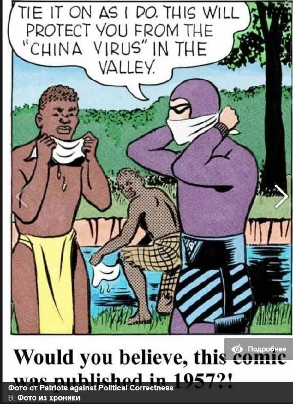 В социальных сетях нашли очередное доказательство того, что "всемирному правительству" о пандемии коронавируса было известно еще за долгие годы до ее начала. На этот раз в качестве доказательства используется сцена из комикса "Призрак" 1957 года, в которой упоминается "китайский вирус": Фантом говорит другому персонажу повязать кусок одежды вокруг рта, чтобы защититься от вируса.