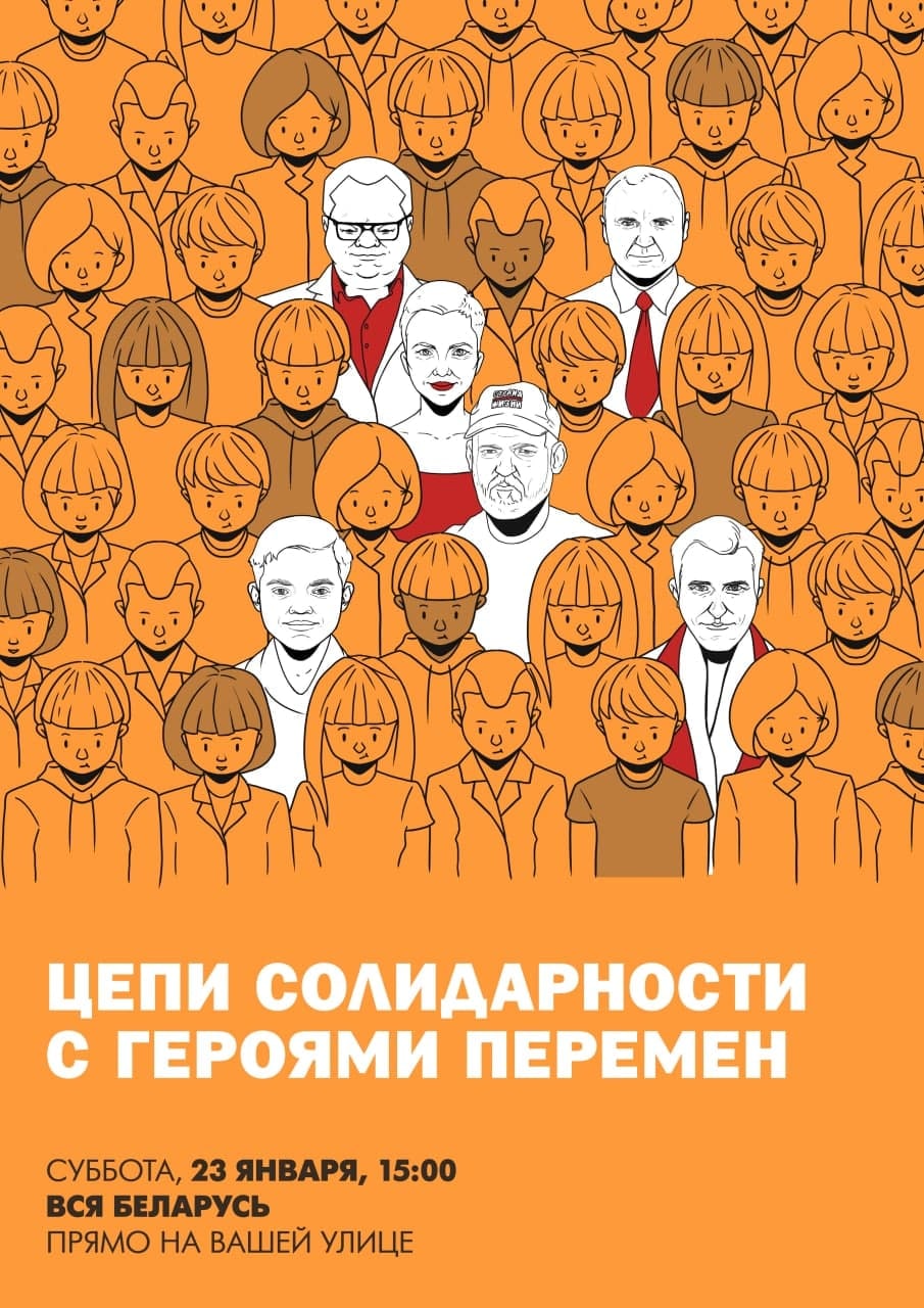 23 января, в субботу в 15:00 мы выйдем по всей Беларуси на первую общенациональную акцию этой зимой – в цепи солидарности с героями перемен, брошенными в тюрьмы. Многие выйдут прямо на улице напротив своего дома, просто примкнув к соседям (или соседи примкнут к вам). Кто-то скоординируется с соратниками для километровых цепей солидарности через весь район. Водители поддержат сигналами. Диаспоры – своими акциями по всему миру, в том числе у гос.учреждений стран, от которых мы ждем дальнейших шагов по противодействию фашистской диктатуре, поднявшей голову в XXI веке.