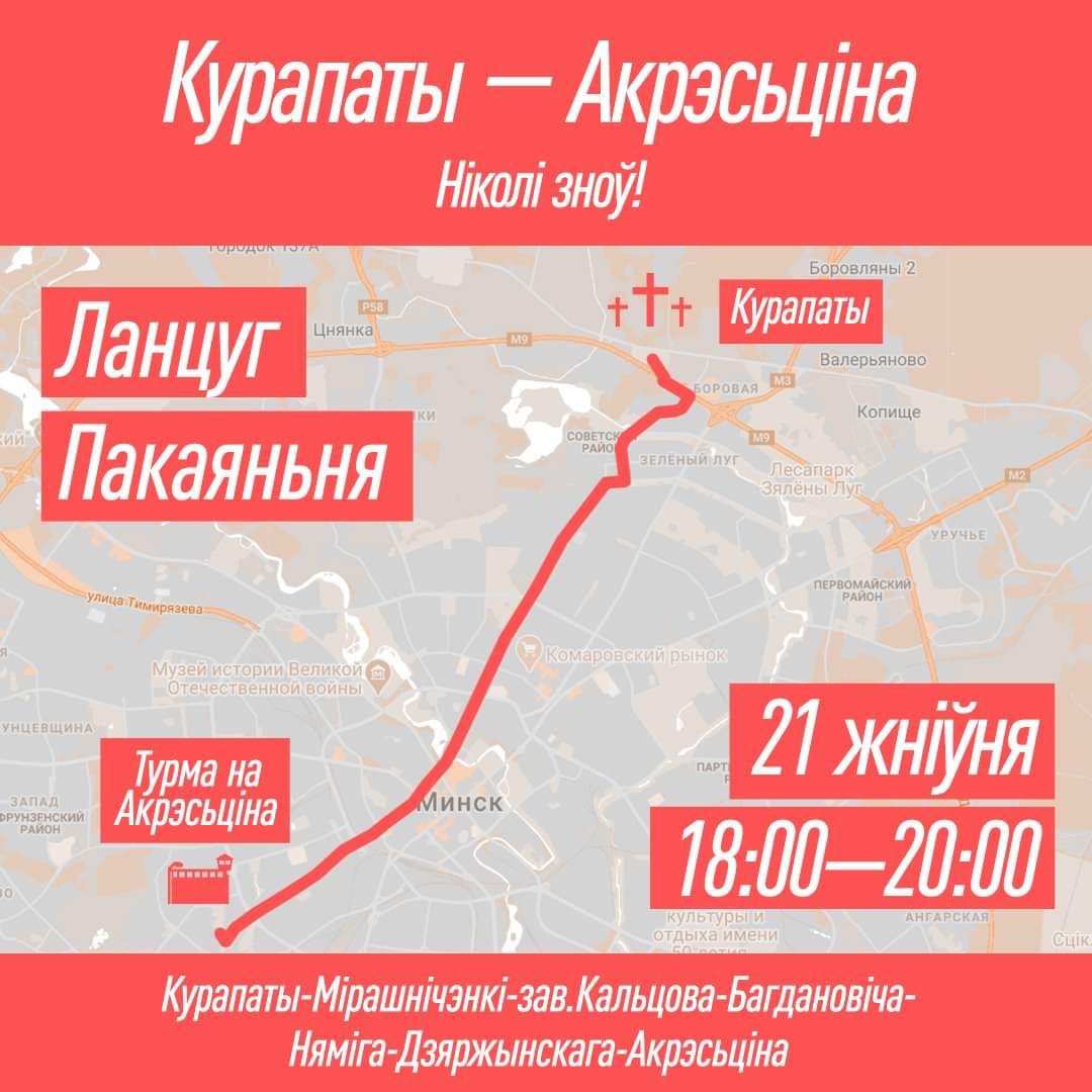 - С 18.00 до 20.00. ЦЕПЬ ПОКАЯНИЯ. Христиане Беларуси станут длинной цепью от Куропат до Окрестина. Каждый день мы будем напоминать убийцам, что их преступления не будут забыты. Присоединяемся к цепи на своём районе (завтра расскажем подробнее).