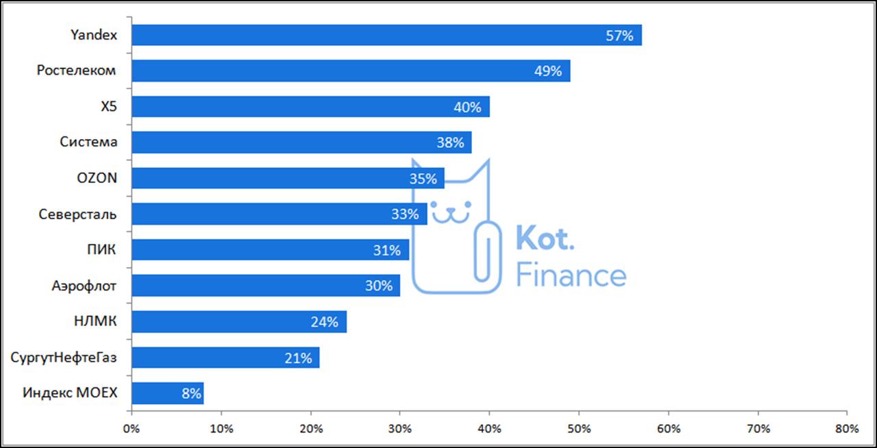 Cделали обзор по индексным компаниям. Вне MOEX безусловными лидерами среди ликвидных компаний стали SFI (+240%), собственник Европлана, ЛЭСК (+198%), и ТНСэнерго (+115%).