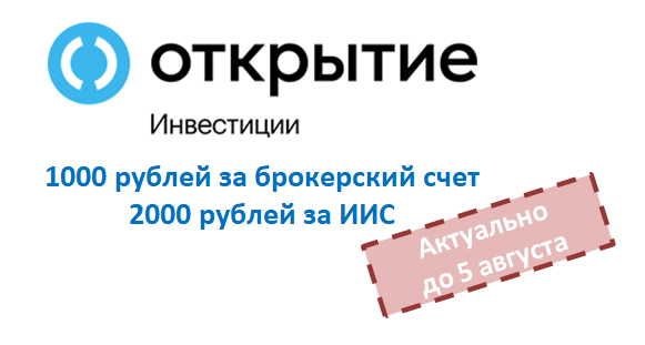 За открытие брокерского счета вы получите кэшбэк 1 000 рублей. За открытие ИИС – 2 000 рублей. Чтобы получить бонус, надо открыть счет по ссылке и прислать мне подтверждение. Предложение в Открытии действует до 5 августа включительно. Актуально только для новых клиентов.
