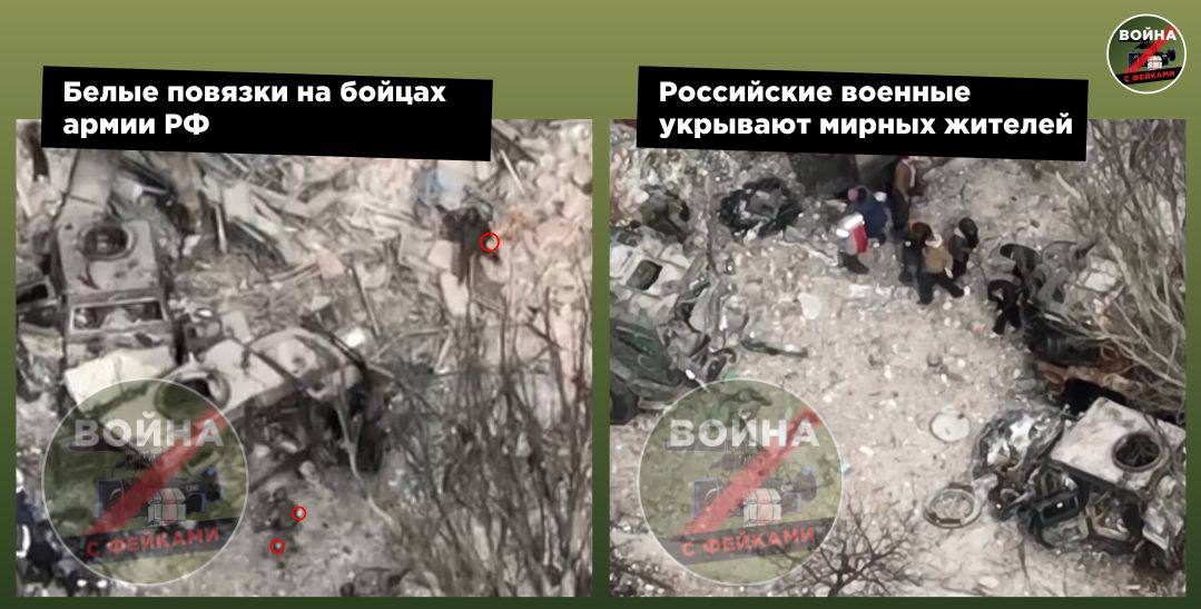 При этом можно заметить (с 2:14), что выходят только 4 человека, и на всех белые повязки — скорее всего солдаты ВС РФ проверяли здание на наличие оставшихся снайперов. Если присмотреться, то можно найти и мирных жителей, в том числе пожилых женщин, опирающихся на палки. Однако из здания они не выходят: весь второй кусок видео они прячутся за российской техникой и спинами российских солдат. После того как здание проверено военнослужащими и установлено, что огневая точка подавлена, людей уводят в безопасное место под прикрытием.