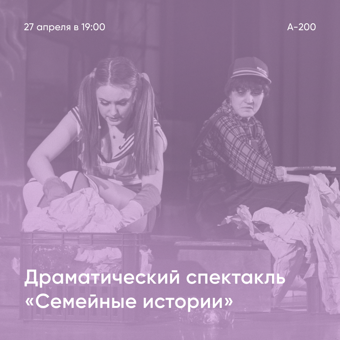 Приглашаем студентов, работников, преподавателей и абитуриентов на показ драматического спектакля «Семейные истории». Он состоится 27 апреля в корпусе на Большой Семеновской в актовом зале (А-200), сбор гостей начнется в 18:40.