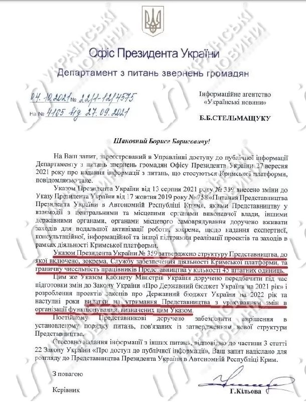 "Указом Президента Украины №359 утверждена структура Представительства, в которую включена, в частности, Служба обеспечения деятельности Крымской платформы, и предельная численность работников Представительства в количестве 45 штатных единиц", - сказано в ответе.