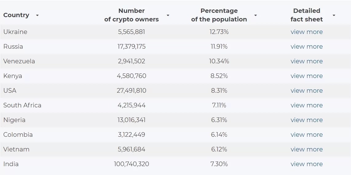 Также сообщается, что Украина является родиной команд, основавших криптостартапы, а также крипторазработчиков. Второе место в рейтинге занимает Российская Федерация, третье — Венесуэла.