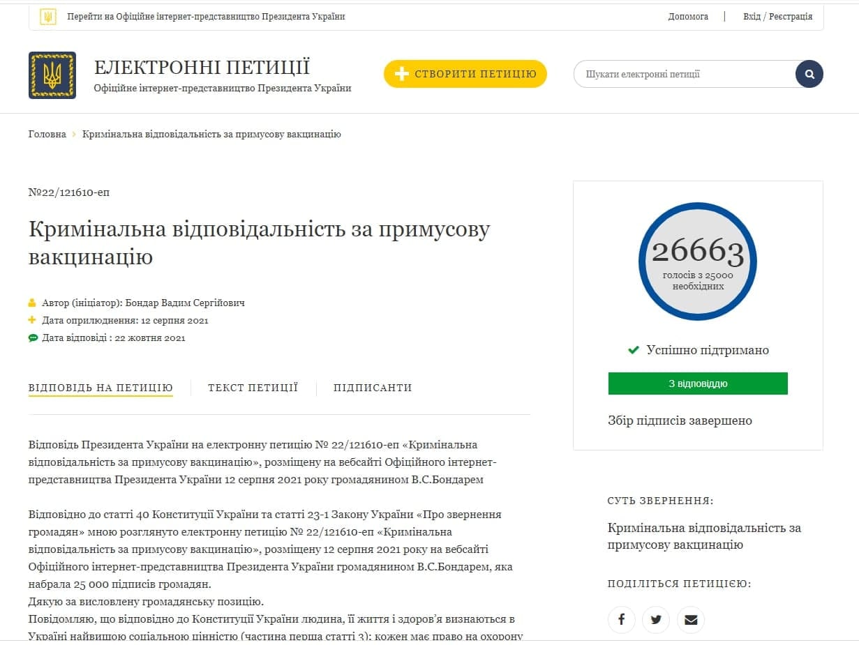 На сайте президента Украины появилась петиций в которой автор призывает ввести уголовную ответственность за принудительную вакцинацию граждан Украины. Сейчас, данная петиция собрала 26663 голоса при необходимых 25-ти тысячах для рассмотрения.