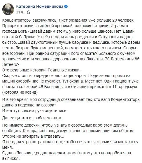 Ножевникова также рассказала, что о кислородных концентраторах приходится договариваться лично, обзванивая тех, кто давно взял аппараты – в надежде на возвращение. Однако это не просто, поскольку у каждого пациента свои особенности: кто-то держит их дома, кто-то элементарно не может принести из-за слабости, кто-то не успел сделать справки и выписки.Девушка также отметила, что в этой ситуации нельзя делить людей по финансовым возможностям, поэтому советует "по знакомству" или за деньги не просить ни концентраторы, ни места в больницах.