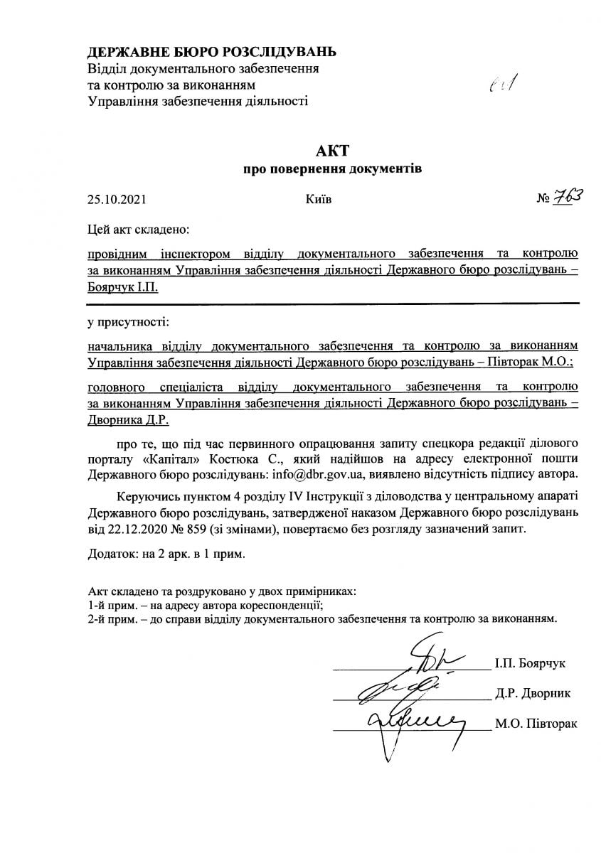 Ведомство отказалось комментировать ход расследования для издания "Капитал" ссылаясь на формальную причину – отсутствие личной подписи журналиста. При этом запрос был отправлен на бланке редакции по электронной почте и, согласно закону, в принципе не предусматривал наличия подписи.