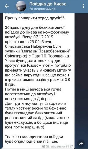"Поездка в Киев. Прошу распространить среди друзей. Собираю группу для бесплатной поездки в Киев на комфортном автобусе. Выезд – 7.12. 2019, ориентировочно в 23:00. С улицы Сичеславская Набережная, возле остановки магазин "Правобережный". Ориентир – офис партии П. Порошенко. У Вас будет достаточно времени для прогулки по Киеву, затем нужно будет принять участие в мирном митинге, на который уйдет пару часов, за что каждый получит компенсацию в размере 300 грн", - сообщил координатор мирного митинга, который должен пройти cегодня, 8 декабря в украинской столице.