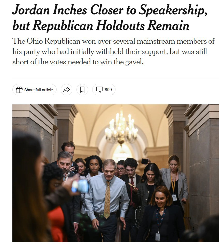 Кандидат в спикеры Конгресса Джим Джордан, которого считают близким к Трампу, увеличил свои шансы на избрание, пишет New York Times.