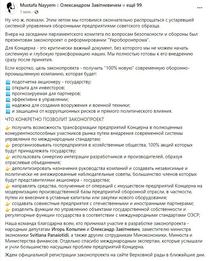 Экс-нардеп и заместитель главы "Укроборонпром" Мустафа Найем представил на заседании парламентского комитета по вопросам безопасности и обороны законопроект, который намерен реформировать оборонно-промышленный комплекс Украины. По словам Найема, закон позволит реорганизовывать госпредприятия в хозяйственные общества, а 100% акций которых будут принадлежать государству, а также: