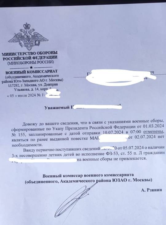 Мы полагаем, что из-за сбоев на мос.ру жалоба в суд все же попала в орган, который прямо повлиял на военкомат, после чего он отступил и отменил призыв Михаила на сборы. В извещении многодетному отцу написали, что его освобождают от сборов из-за наличия троих несовершеннолетних детей.