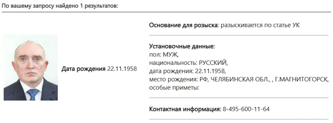 Экс-губернатора Челябинской области Бориса Дубровского объявили в розыск по уголовной статье, сообщается в базе МВД. Полиция не раскрывает статью, но ранее силовики арестовали министра дорожного хозяйства и транспорта региона Алексея Нечаева по делу о воровстве 3 млрд рублей из бюджета на строительстве дорог в 2015-2017 годах.