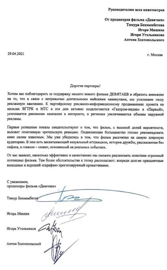 Фильм в прокате всего несколько дней, нет даже первых показателей по сборам. И тем не менее, его авторы вместо того, чтобы почивать на лаврах положительных отзывов, лично занимаются продвижением. Сначала Бекмамбетов, Угольников, Мишин и Златопольский организовали дополнительную рекламную кампанию на «Первом», ВГТРК, на ресурсах МТС и «Газпром Медиа». А теперь напрямую обратились во все кинотеатры страны и просто попросили поддержки. Так поступают в своих проектах далеко не все киноделы.