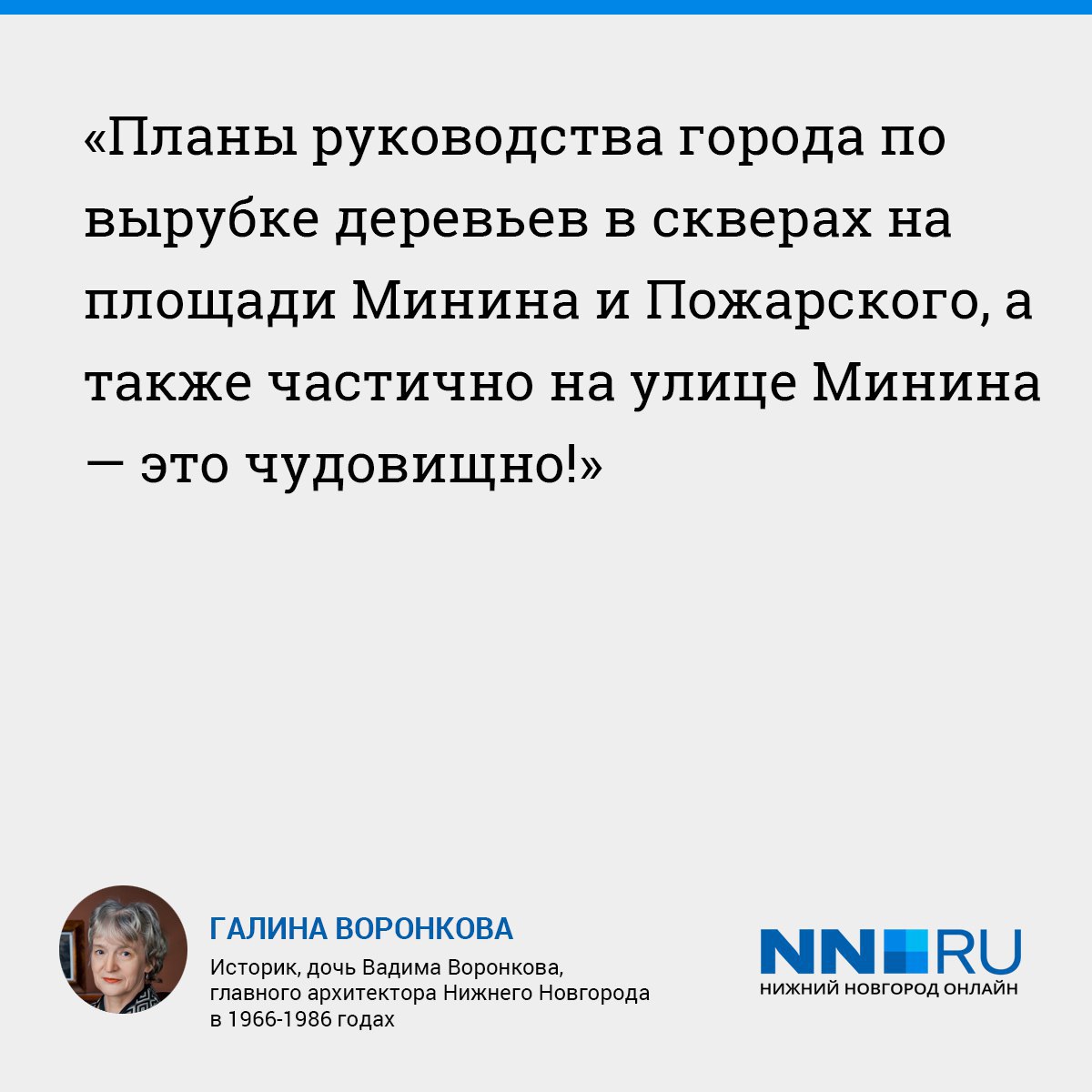 6 ноября мэрия должна была выбрать подрядчика на вырубку деревьев в центре города. Чиновники это называют «планировкой ландшафта». А вот историк Галина Воронкова, дочь главного архитектора Нижнего Новгорода в 1966–1986 годах Вадима Воронкова, считает это чудовищным.