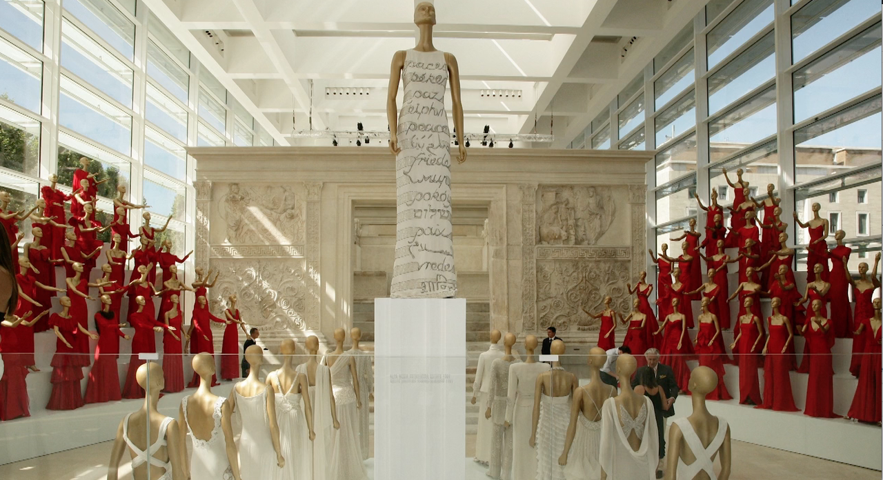 14 лет спустя модель алек век в платье «мир» сопровождала валентино на кинофестивале в венеции-2005, а в 2007-м выставка в честь 45-летия valentino (1,5-минутный обзор тут) открылась у римского алтаря мира – античного сооружения из мраморных барельефов, прославлявшего императора августа, который установил мир по всей империи. первоначально алтарь раскопали ещё в XVI веке в другом месте рима и его фрагменты раздарили; в XX веке его решили собрать заново, недостающие элементы заменили копиями и накрыли стеклянным куполом в традициях тоталитарной архитектуры; в XXI веке его к ярости многих итальянцев заменили вызывающе белым модернистским зданием 🇺🇸 ричарда мейера (автора калифорнийского музея гетти и римской же юбилейной церкви). новое здание открылось с 4-летним опозданием в 2006-м.