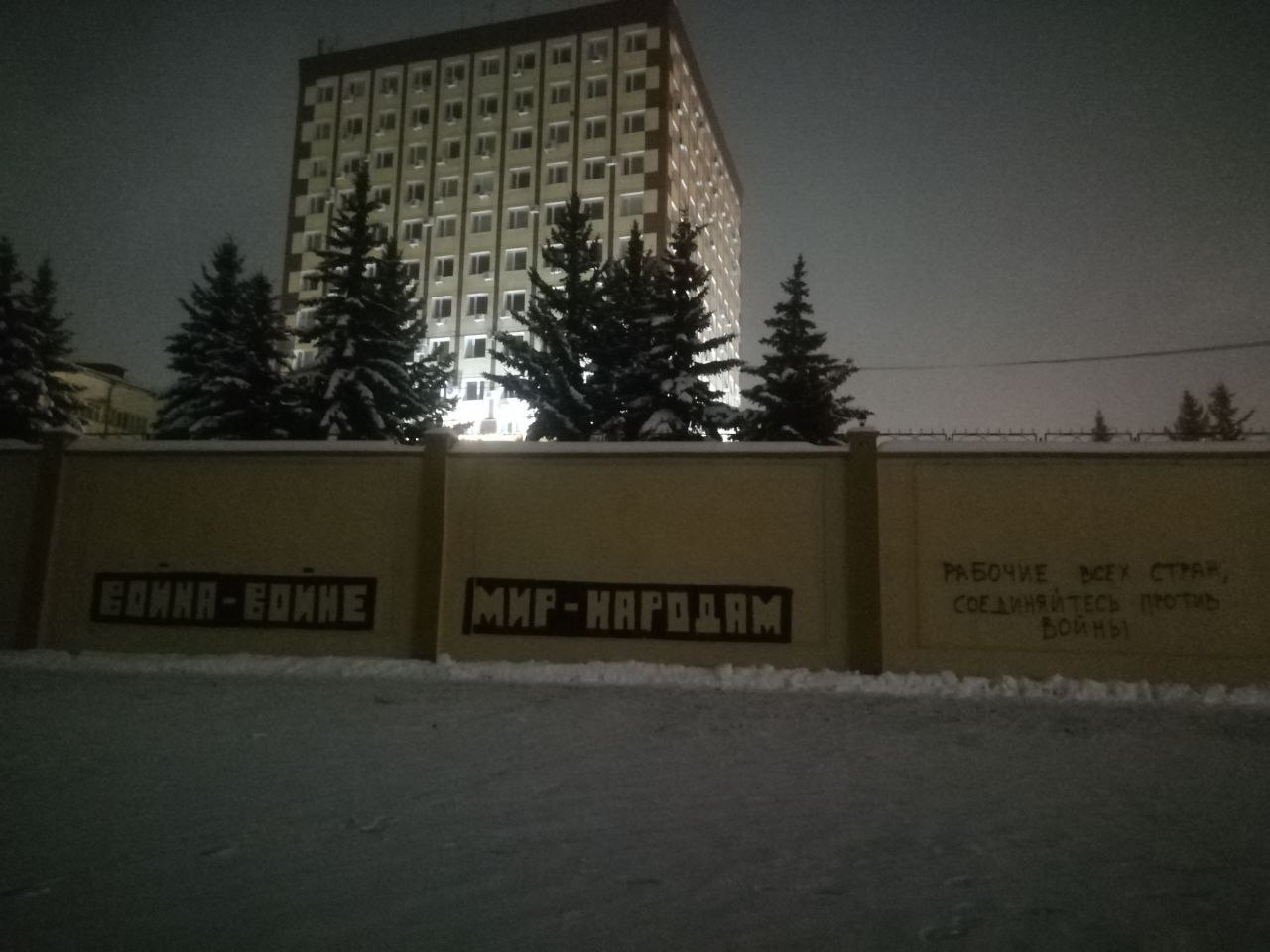 На следующее утро после акции граффити было закрашено. Можно подумать, что администрацию города заботит чистота стен. Но это не так. Стены вокруг здания администрации изрисованы, в том числе и рекламой наркоты. Да весь город загажен рекламой наркоты, а власти ничего с этим не делают. Да даже рядом с антивоенным граффити, буквально в метре от него, уже полгода нарисовано другое граффити. Его никто все эти месяцы не трогал. Не тронул и в этот раз. Антивоенный призыв закрасили. А граффити рядом с ним нет."