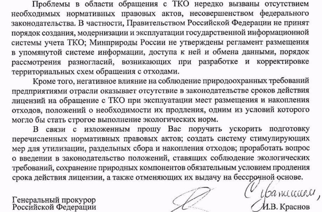 В связи с несовершенством федерального законодательства в области обращения с ТКО, Генеральный прокурор Игорь Краснов обратился к правительству о прекращении бессрочной выдачи лицензий на обращение с ТКО. Их продление должно напрямую зависеть от «строгого выполнения экологических норм».