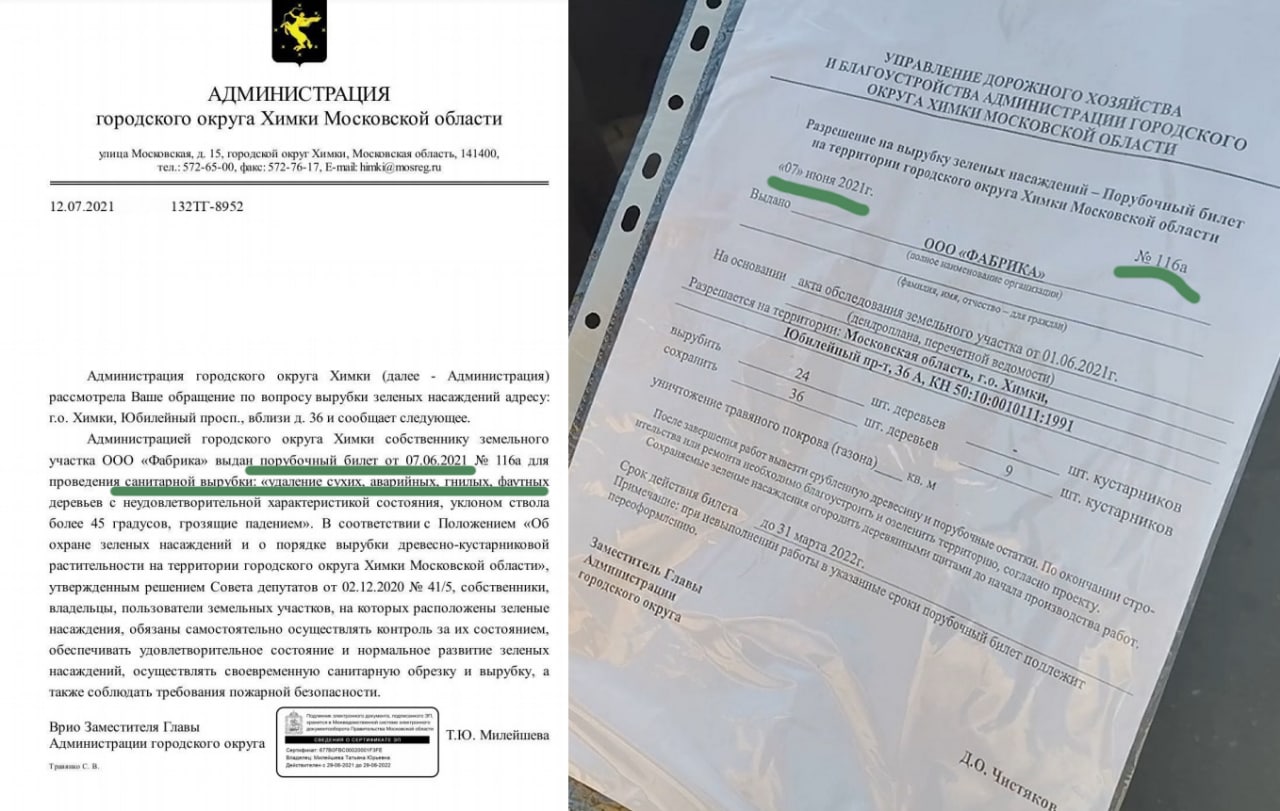 Однако, как уточняют в редакции, в порубочном билете такой информации нет. Вырубкой занимается компания ООО «Фабрика».