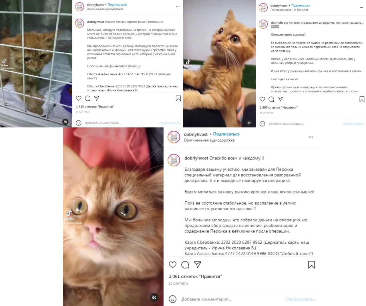 Так, например, 17 сентября «Добрый хвост» объявил сбор средств на содержание, обработку от блох и глистов для бездомного котенка. Спустя 7 дней в соцсетях клиники появился пост, в котором деньги собирали уже для обследования на неизлечимые инфекции и погашение растущего долга (откуда он взялся, не уточнялось). А 28 сентября «Добрый хвост» сообщил, что у котенка разрыв диафрагмы (с такой травмой животные живут 3-4 дня). Как котенок получил повреждения так же не сообщалось. В итоге 4 октября клиника сообщила, что животное не пережило операцию.