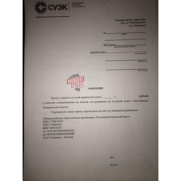Сегодня, 6 декабря, в группе «Инцидент Кузбасс» ВКонтакте» появился пост с фото формального внутреннего заявления «СУЭК» (Сибирская угольная энергетическая компания, шахта «Листвяжная» принадлежит компании «СУЭК-Кузбасс» через АО ХК «СДС-Уголь»). В заявлении рабочим предлагают удержать часть зарплаты в пользу пострадавших.
