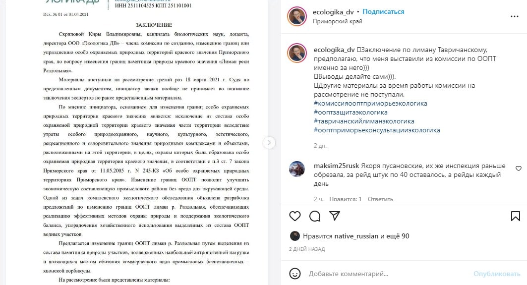 Власти Приморья назвали изменения в составе комиссии «плановой ротацией». Но не сказали, почему вместе с формальными перестановками, а-ля руководитель-зам, совет покинули директор Амурского филиала WWF России Петр Осипов, руководитель центра «Амурский тигр» Сергей Арамилев и эколог Кира Скрипова, которые критиковали изменения ООПТ Тавричанского лимана и ликвидацию памятника природы «Лиман реки Раздольная».