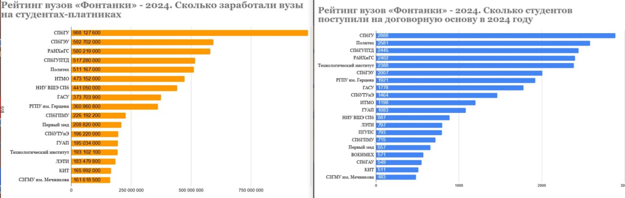 Лидирует в рейтинге СПбГУ, где самый популярный факультет — юридический: 249 человек выбрали платную «Юриспруденцию», а 124 — «Юриспруденцию с углубленным изучением китайского языка и права КНР». При этом сильно вырос прием на договорную основу и в других вузах различных направлений: в Педиатрическом университете, Университете гражданской авиации, Академии художеств имени Репина и спортивном НГУ имени Лесгафта (в последнем аж на 77,5%).