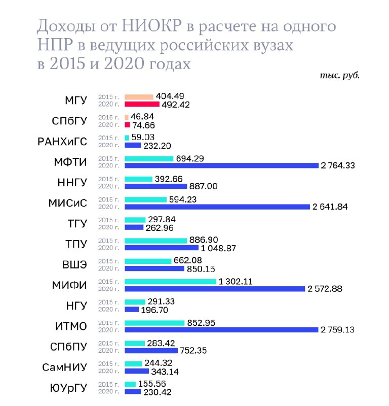 Если у показателей образовательной деятельности динамика положительная, то в научно-исследовательской сфере университеты, напротив, в числе отстающих. Как это может быть, если речь идет о двух ведущих вузах страны? Опять же из-за методики подсчета, которая в данном случае Счетную палату устраивает. По ней считаются доходы от НИОКР в расчете на одного научно-педагогического работника. В МГУ это 492 тыс. рублей, в СПбГУ —75 тыс. рублей, а ИТМО, МИСиС, МИФИ, МФТИ получали от НИОКР более 2 миллионов рублей на человека.
