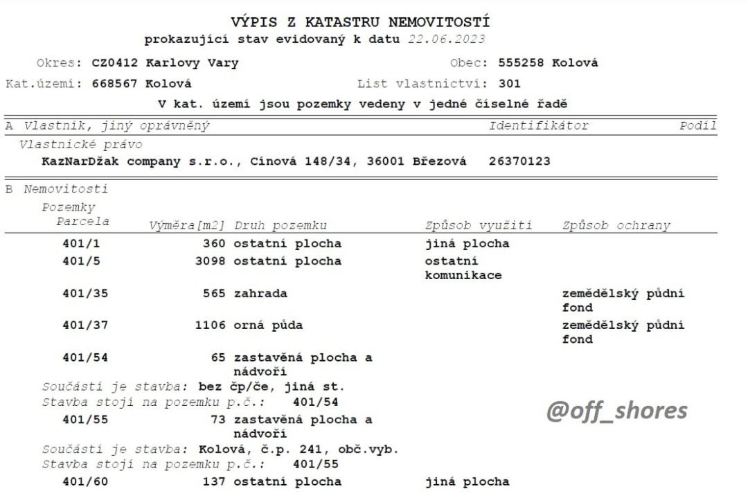 Идем в чешский кадастр и запрашиваем сведения, какая недвижимость принадлежит KazNarDžak company s.r.o. Это стоит €8,5.