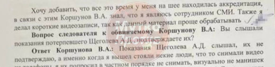 Дело в том, что согласно показаниям Александра Щеголева, во время драки на его шее на видном месте висела аккредитация журналиста. Именно эти показания лежат в основе обвинения в отношении Коршунова (в случае, если защите удастся доказать, что у Щеголева не было аккредитации на видном месте, то дело, скорее всего придётся переквалифицировать на более мягкую статью).